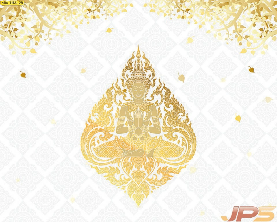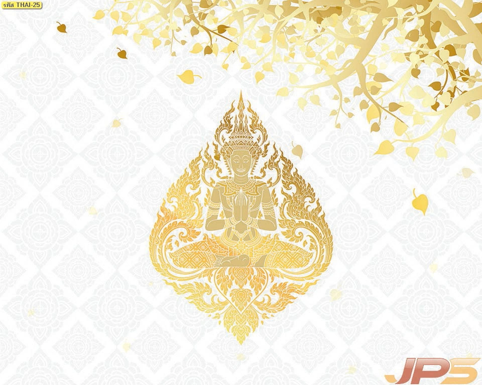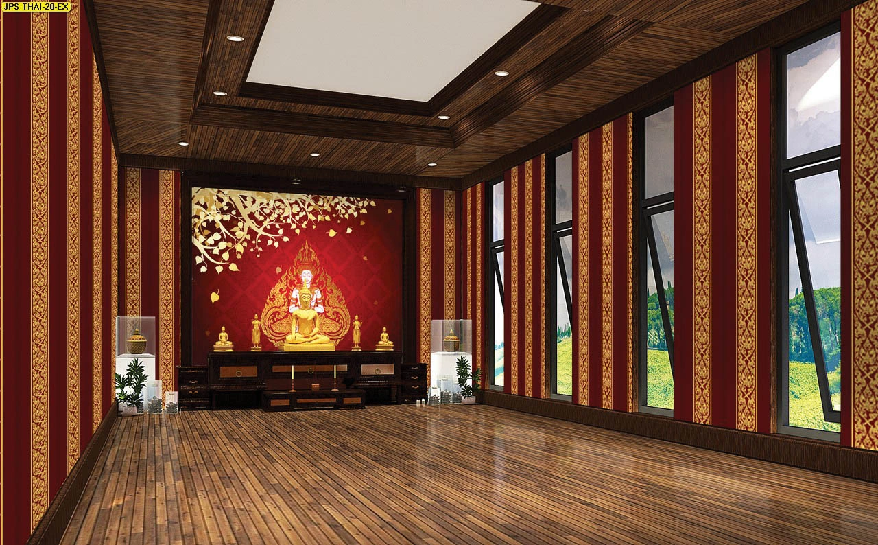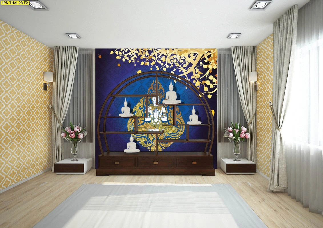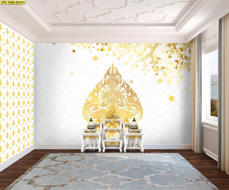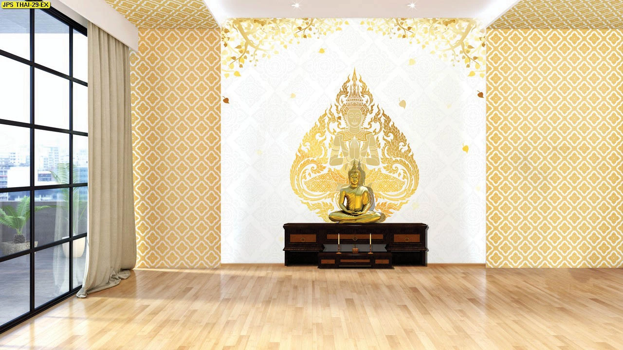วอลเปเปอร์ใบโพธิ์แคนวาสกันแสงทึบ ประดับฉากหลังหิ้งพระด้วยลวดลายไทยประยุกต์ให้ความรู้สึกสงบและทันสมัย