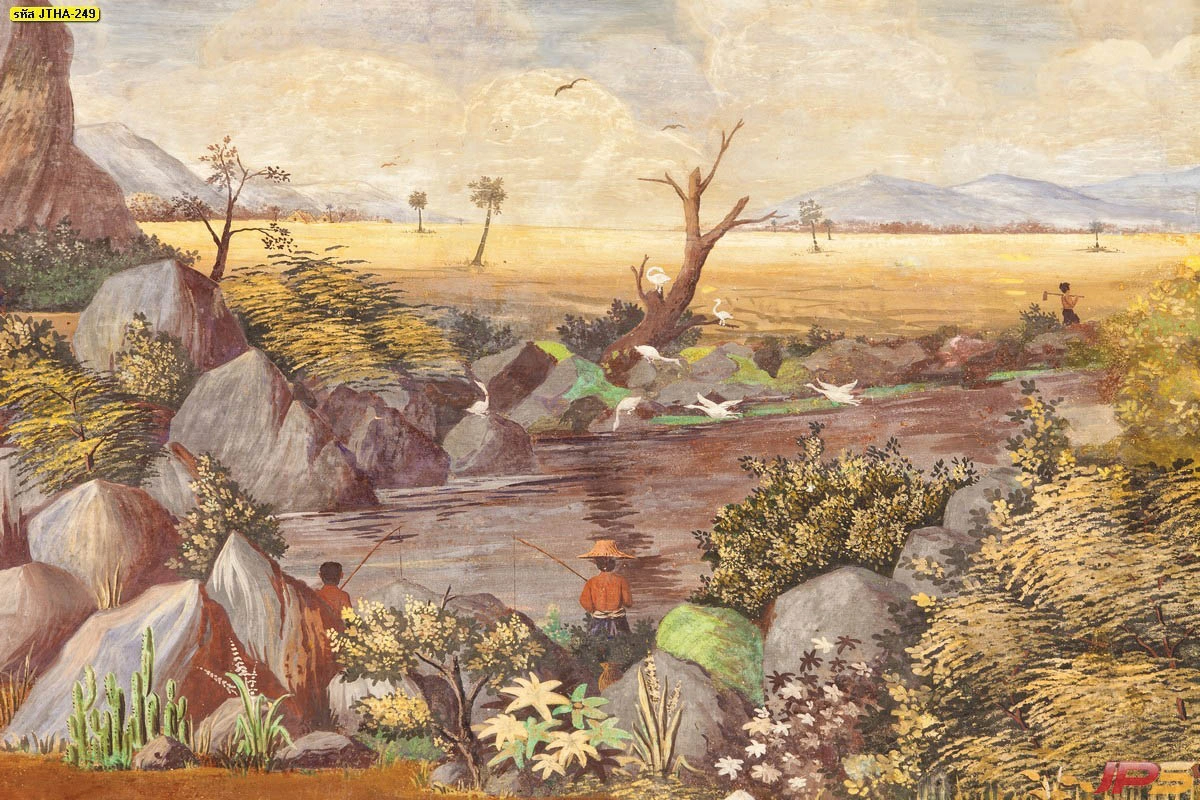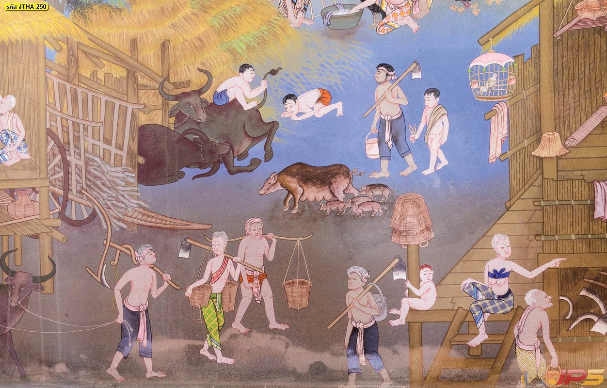 รูปวาดเล่าเรื่องชุมชนไทยโบราณ แสดงวิถีชีวิตการอยู่อาศัยบนเรือนไทยที่ล้อมรอบด้วยธรรมชาติป่าไม้อันอุดมสมบูรณ์