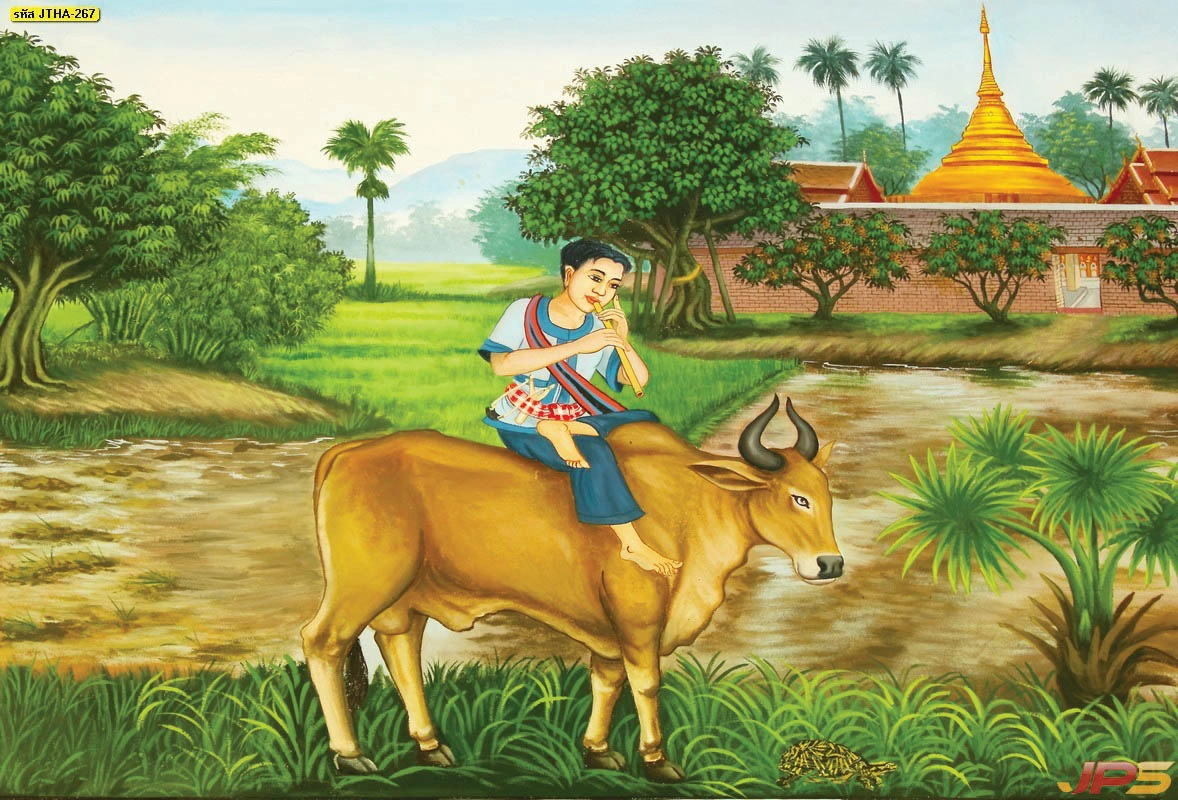 วอลเปเปอร์จิตรกรรมไทย แสดงภาพคนขี่ควายเป่าขลุ่ยหน้าวัดวาอารามที่ดูเงียบสงบผ่อนคลายจิตใจ