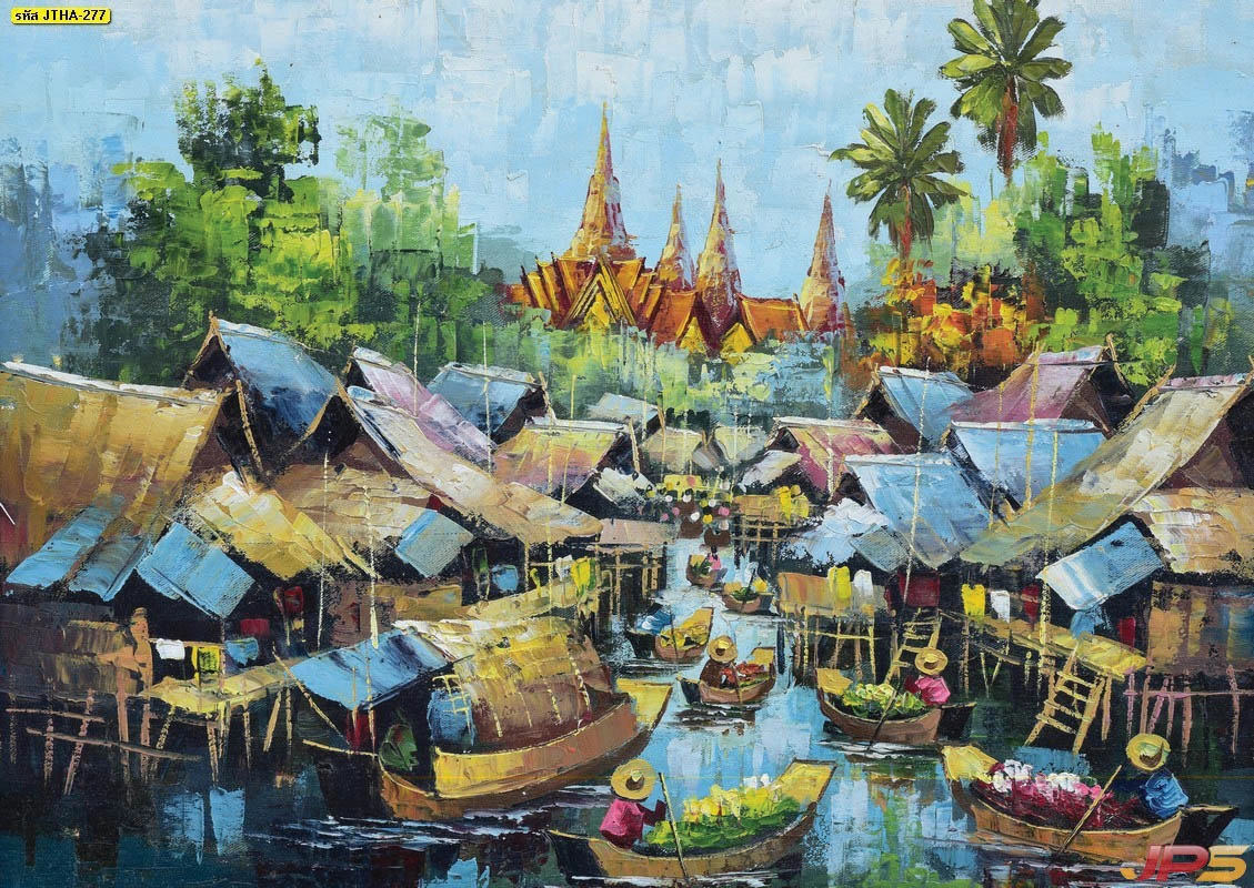ภาพพิมพ์จิตรกรรมวิถีบ้านและชุมชนไทยแบบสีน้ำมันเทคนิคเกรียงถ่ายทอดบรรยากาศตลาดน้ำและวิถีชีวิตริมคลองที่มีชีวิตชีวา