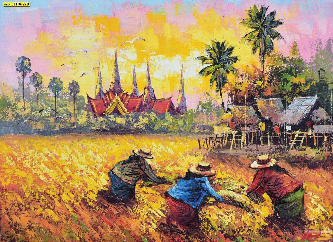 ภาพติดผนังมงคลชุดวิถีชีวิตไทยชนบท รูปชาวนากำลังเก็บเกี่ยวข้าวในนาสีทองพราวข้างวัดไทยสวยงามอลังการ