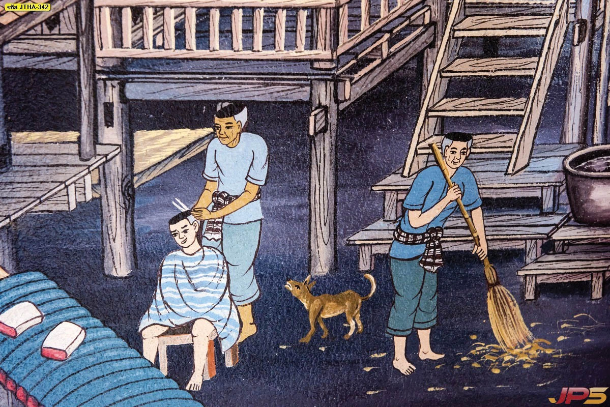 รูปวาดเล่าเรื่องชุมชนไทยโบราณ แสดงวิถีการตัดผมใต้ถุนเรือนไทยซึ่งเป็นเอกลักษณ์การใช้ชีวิตที่หาดูได้ยากในปัจจุบัน