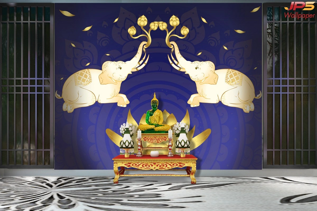 วอลเปเปอร์ลายช้างคู่ชูดอกบัวติดผนังห้องพระ เสริมบรรยากาศสงบอย่างมีระดับ