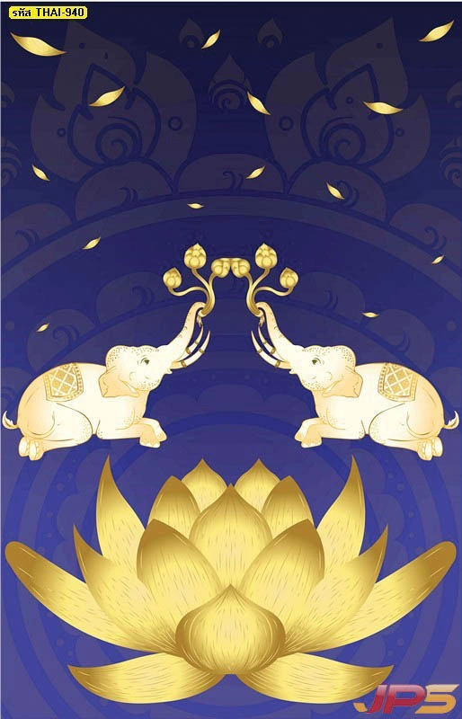 ภาพมงคลลายช้างไทยคู่ชูดอกบัวพื้นหลังสีน้ำเงินทอง ลวดลายไทยสมมาตรเหมาะกับการตกแต่งห้องพระและพื้นที่สงบภายในบ้าน