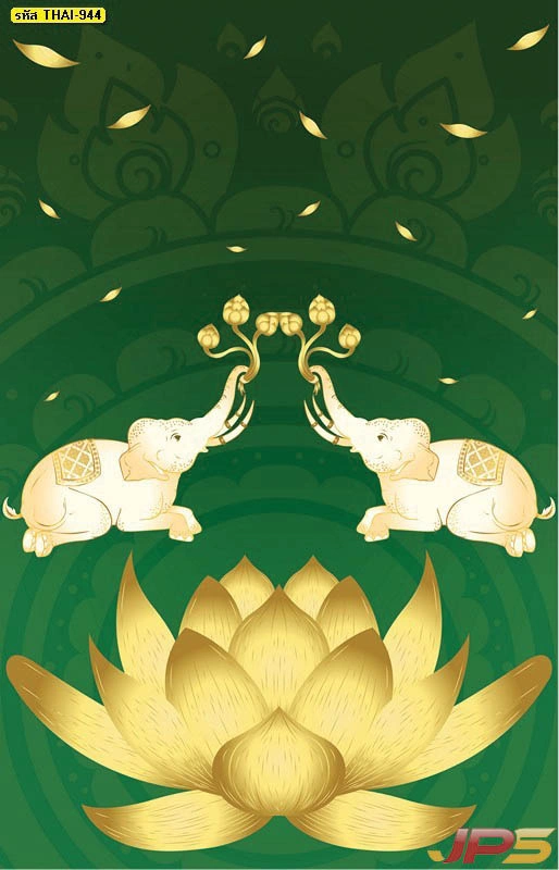 ภาพช้างคู่ชูดอกบัวพื้นหลังสีเขียวทอง สื่อถึงความสมดุล ความร่มเย็น เหมาะกับการตกแต่งห้องพระและพื้นที่พักผ่อนเชิงจิตใจ