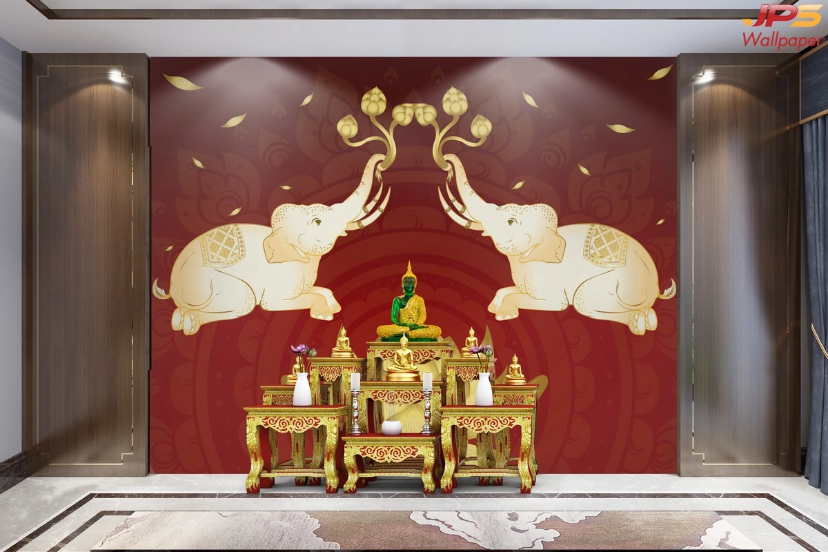 ตัวอย่างห้องพระติดตั้งวอลเปเปอร์ลายช้างคู่ชูดอกบัวสีแดงทอง ช่วยเพิ่มความโดดเด่นให้ผนังและสร้างจุดโฟกัสภายในห้อง