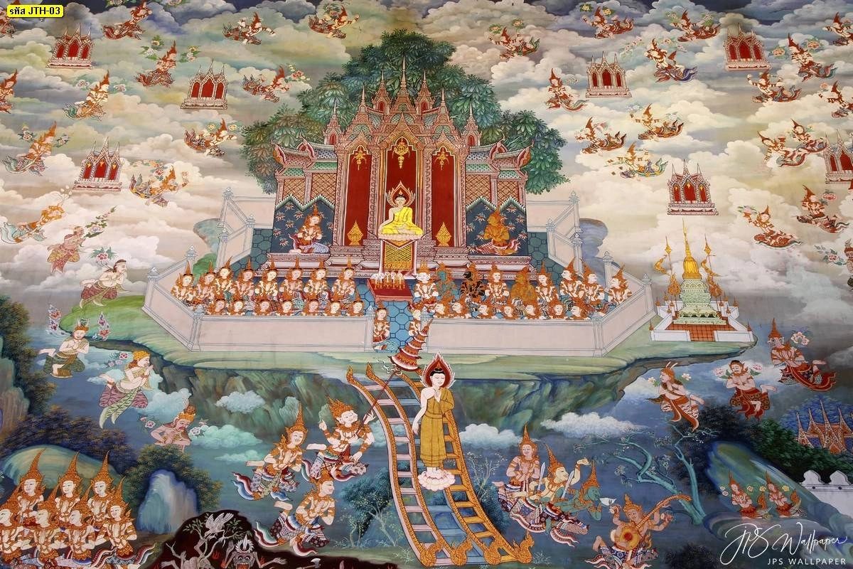 วอลเปเปอร์ลายพุทธประวัติฉากเสด็จลงจากสวรรค์ชั้นดาวดึงส์ งานพิมพ์ละเอียดสูงสำหรับประดับโถงวัดและห้องพระขนาดใหญ่