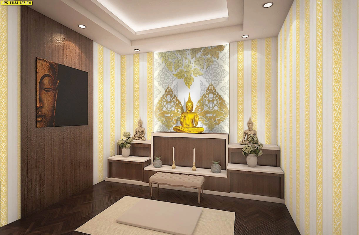 การตกแต่งห้องพระขนาดเล็กด้วยวอลเปเปอร์เทพพนมพื้นสีเหลืองทองสลับลายแถบตั้งที่ช่วยให้เพดานห้องดูสูงโปร่งและโอ่โถงขึ้น