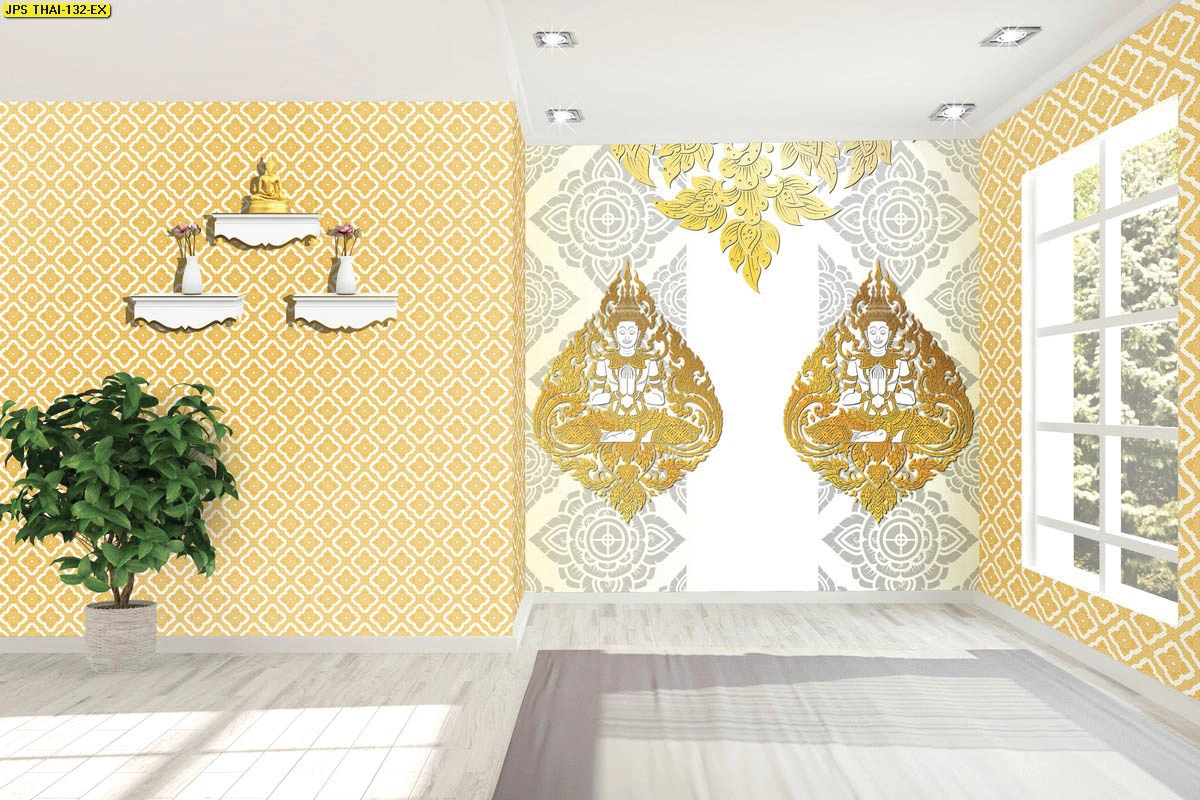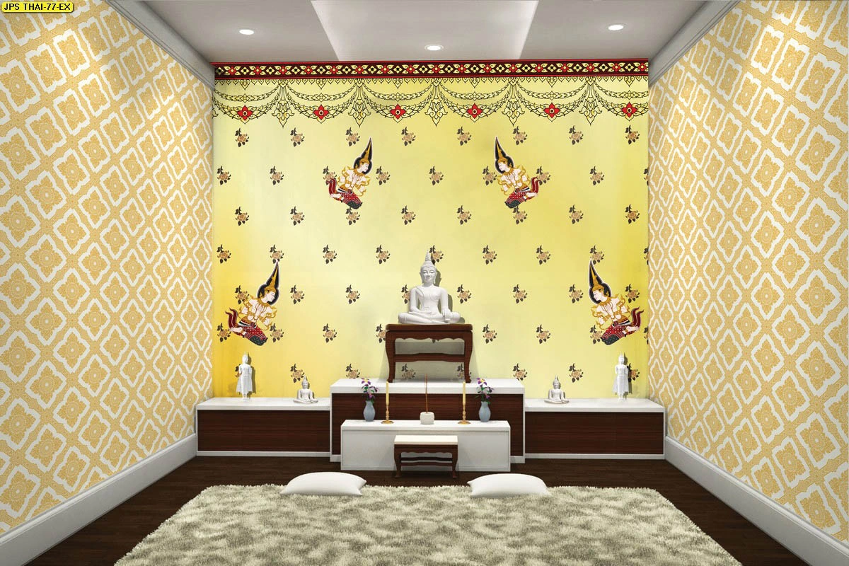 วอลเปเปอร์เทพพนมพื้นสีเหลืองทองที่ตกแต่งด้วยลวดลายพุ่มข้าวบิณฑ์แบบโบราณช่วยเสริมความโดดเด่นและสว่างไสวให้กับผนังประธานห้องพระ