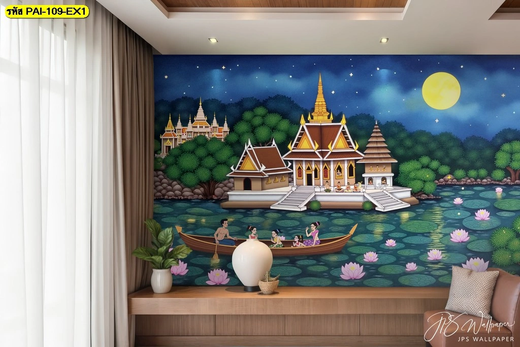 วอลเปเปอร์ลายไทย ภาพเรือคนพายในแม่น้ำท่ามกลางบรรยากาศคืนเดือนเพ็ญ สำหรับตกแต่งห้องรับแขกสไตล์ไทย