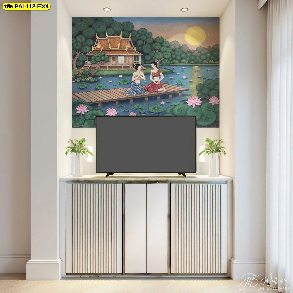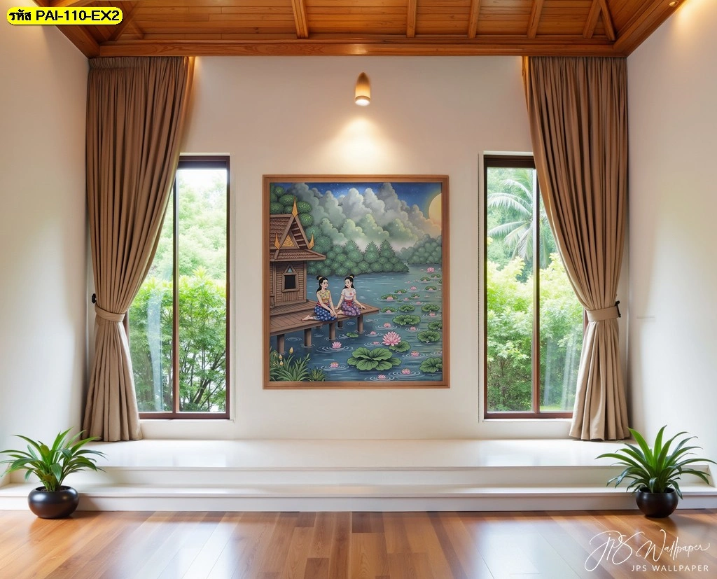 วอลเปเปอร์ภาพวาดลายไทยวิถีชีวิตริมน้ำสวยงามติดตั้งในกรอบไม้หรูหรา สำหรับตกแต่งผนังอาคารสำนักงานหรือโถงต้อนรับอย่างมีสไตล์