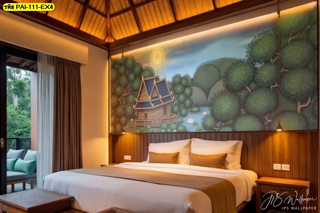 วอลเปเปอร์ลายไทยประเพณีติดตั้งเป็นภาพหัวเตียงในห้องพักโรงแรม ช่วยยกระดับความหรูหราด้วยลวดลายจิตรกรรมอันประณีต