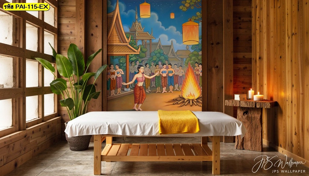 วอลเปเปอร์ลายไทยโมเดิร์นสำหรับสปาลายประเพณีลอยกระทงและโคมยี่เป็งสร้างบรรยากาศการพักผ่อนในห้องนวดสปาสุดผ่อนคลาย