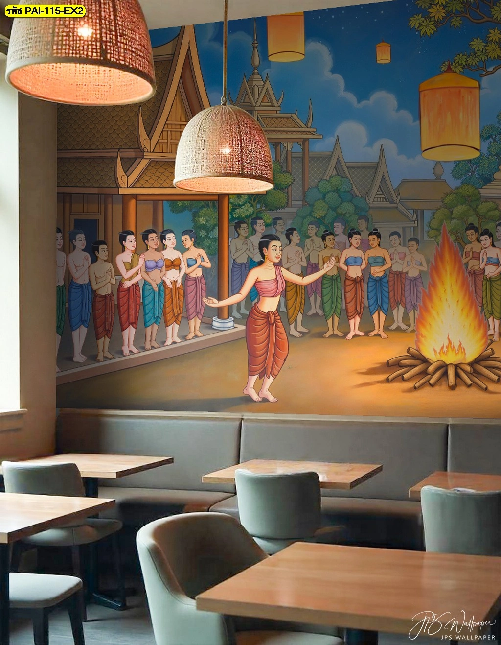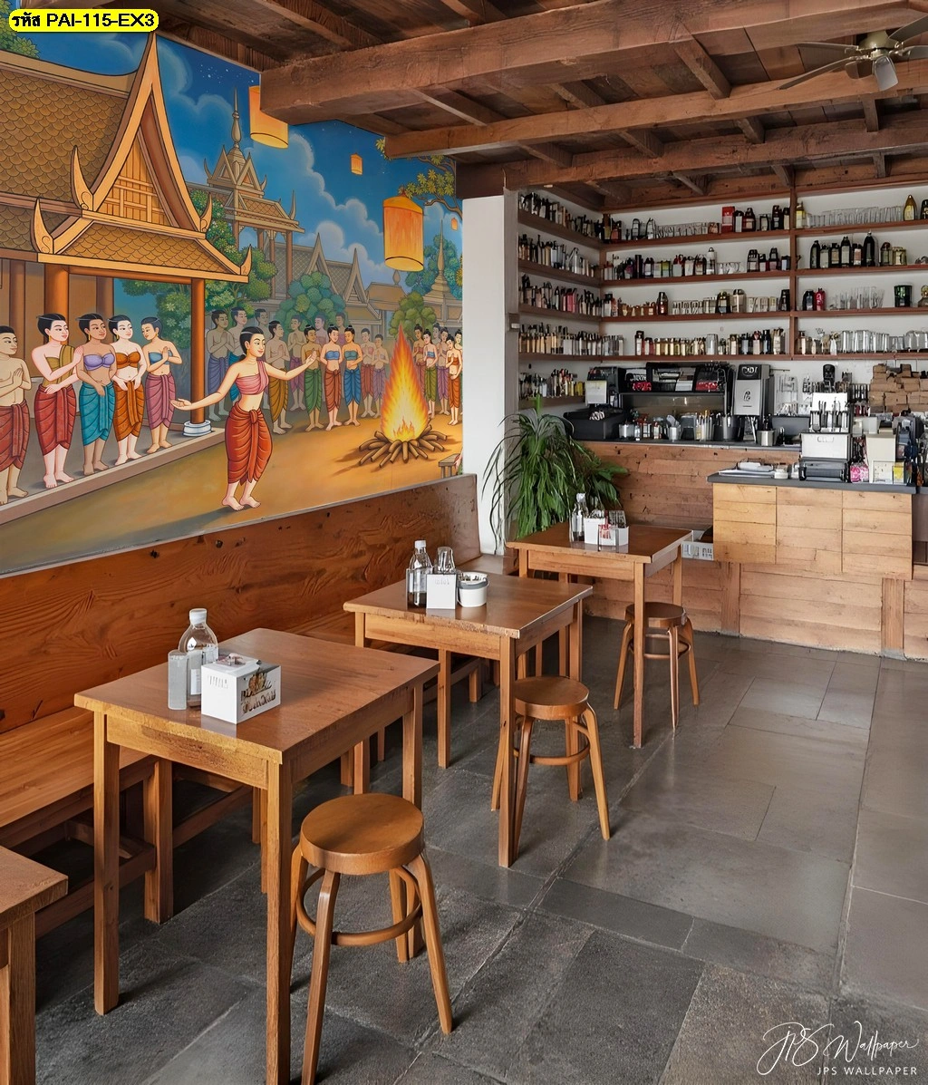 รับพิมพ์วอลเปเปอร์ลายไทยตามขนาดพื้นที่ลายประเพณีพื้นบ้าน ตกแต่งผนังร้านกาแฟและบาร์สร้างบรรยากาศกึ่งร่วมสมัยที่ลงตัว