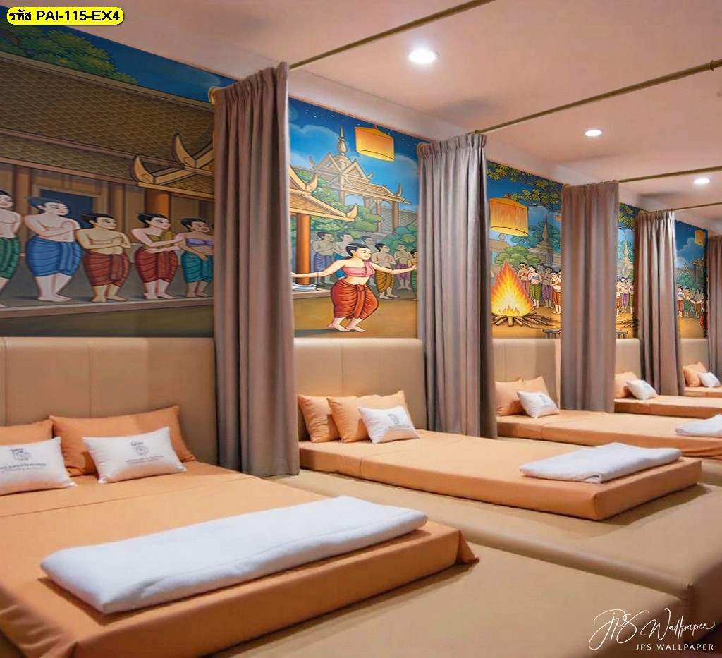 ในพื้นที่ที่ต้องการความสงบอย่างสถานประกอบการความงาม วอลเปเปอร์ลายไทยโมเดิร์นตกแต่งสปา ทำหน้าที่ปรับจูนอารมณ์ของลูกค้าให้เข้าสู่โหมดการพักผ่อนได้อย่างรวดเร็ว ด้วยโทนสีที่นุ่มนวลและลายเส้นที่อ่อนช้อย นอกจากนี้เรายังมีบริการ สติ๊กเกอร์ติดกระจกลายไทยประเพณีลอยกระทง โดยใช้สติ๊กเกอร์ 3M คุณภาพสูง เพื่อสร้างความเป็นส่วนตัวในห้องทรีตเมนต์แต่ยังคงความสวยงามมองเห็นได้จากภายนอก ความสวยงามที่ลงตัวนี้จะช่วยเสริมสร้างความเชื่อมั่นในคุณภาพบริการ ทำให้ลูกค้าตัดสินใจกลับมาใช้บริการซ้ำอย่างแน่นอน