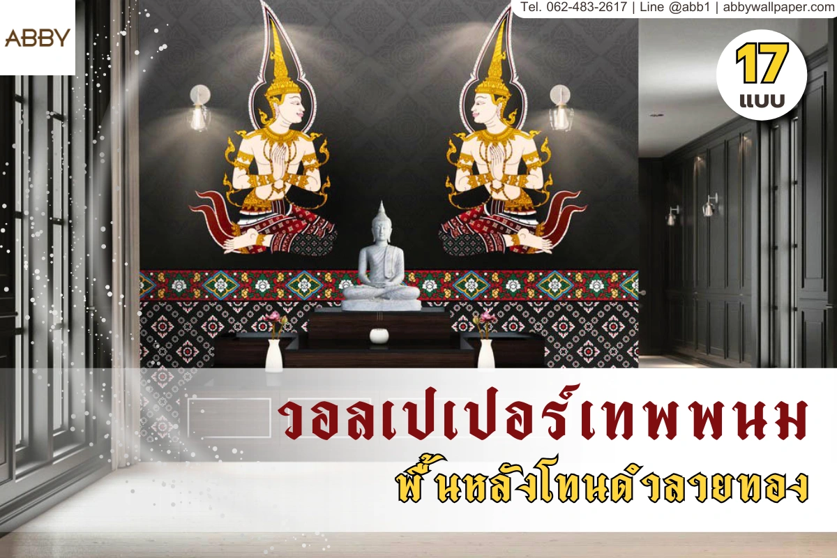 วอลเปเปอร์ห้องพระโทนดำทองเหมาะกับงานออกแบบที่ต้องการความร่วมสมัย โดยยังคงกลิ่นอายไทย ลายเทพพนมสามารถจัดวางแบบสมมาตรหรือแบบกระจาย เพื่อให้เข้ากับขนาดห้องที่แตกต่างกัน รวมถึงสามารถใช้ร่วมกับสติ๊กเกอร์ 3M ติดกระจกห้องพระ เพื่อเพิ่มรายละเอียดในพื้นที่กระจกหรือช่องแสง