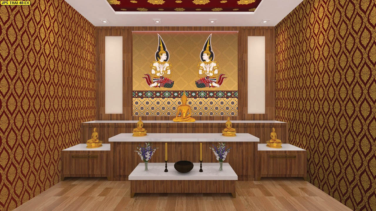 จากภาพตัวอย่างด้านล่างแสดงการติดตั้งร่วมกับแท่นบูชา ผนังหลักใช้ภาพเทพพนม ส่วนผนังด้านข้างใช้ลายไทยซ้ำเพื่อเชื่อมบรรยากาศทั้งห้องให้ต่อเนื่อง