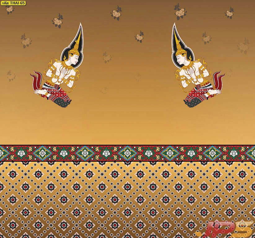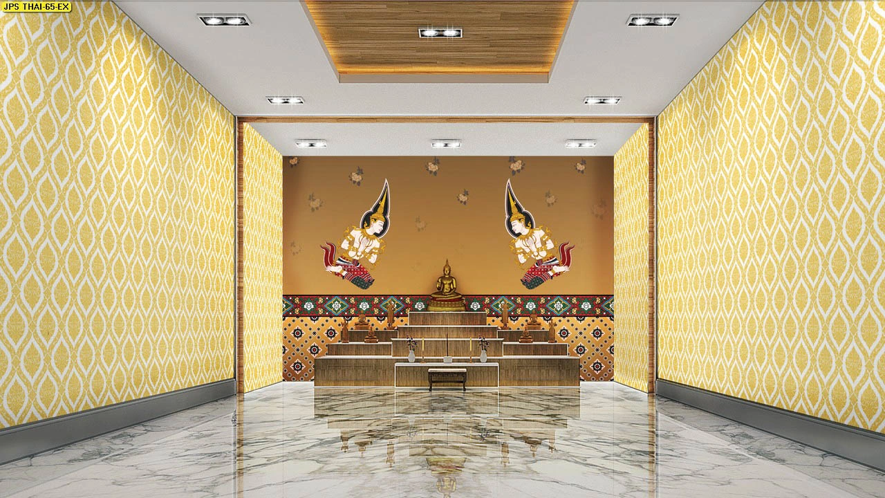 จากตัวอย่างจะเห็นการใช้พื้นหลังโทนทองไล่เฉด เพิ่มลวดลายดอกไทยด้านบน ทำให้ผนังดูมีชั้นเชิงมากขึ้นโดยไม่รกสายตา