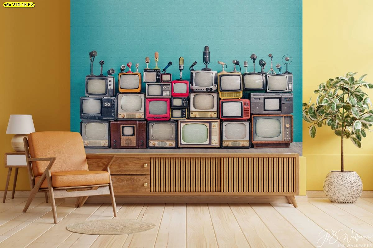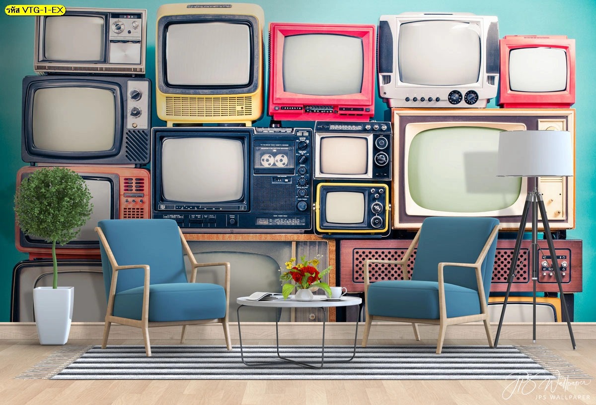 รูปภาพตกแต่งห้องแนววินเทจโบราณลวดลายทีวีเก่าหลากสี ตกแต่งห้องนั่งเล่นสไตล์เรโทร เหมาะสำหรับนักสะสมสื่อบันเทิงยุคเก่า