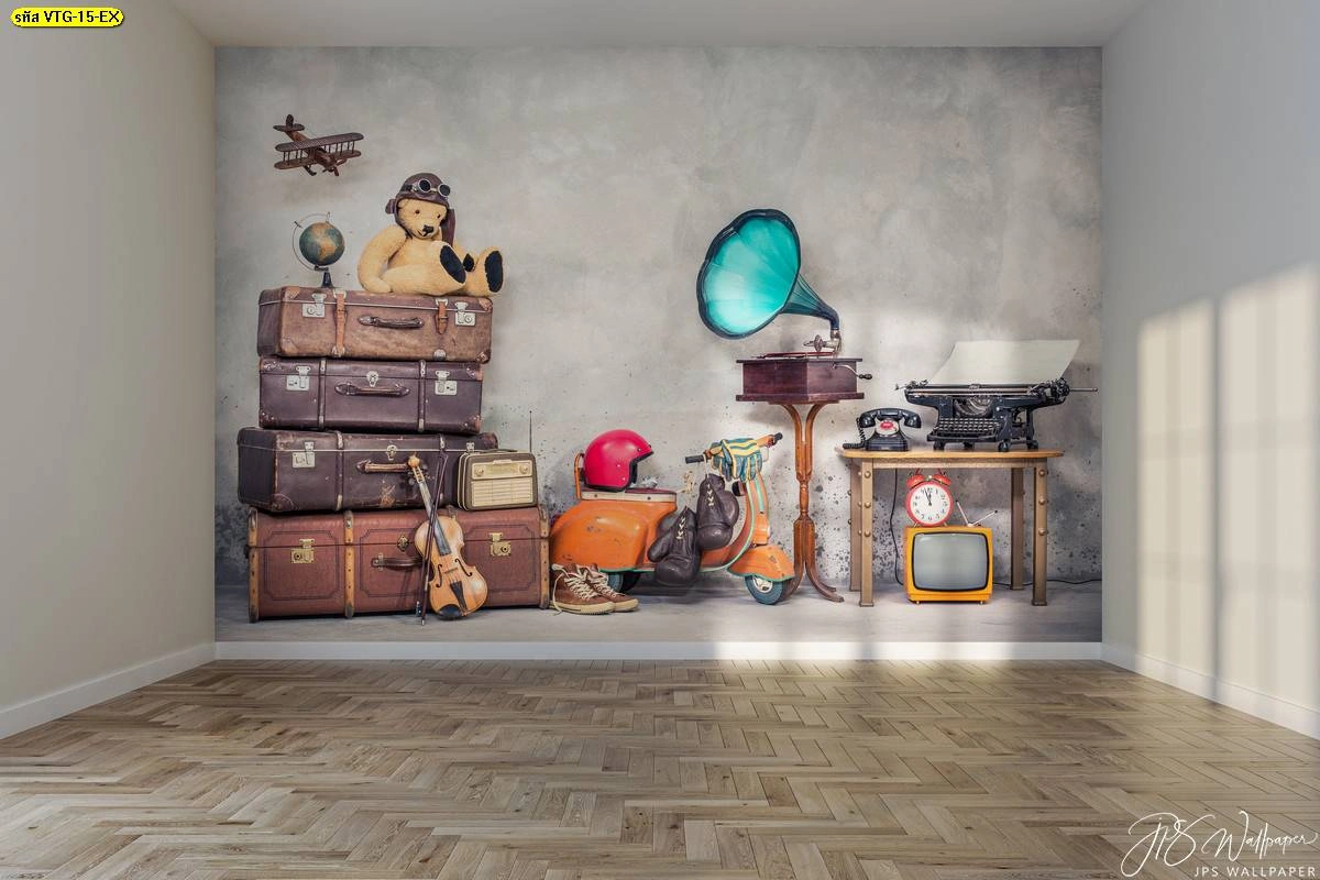วอลเปเปอร์ศิลปะเรโทร วินเทจลวดลายของสะสมเดินทางแบบโบราณ ตกแต่งห้องเด็กสไตล์วินเทจ