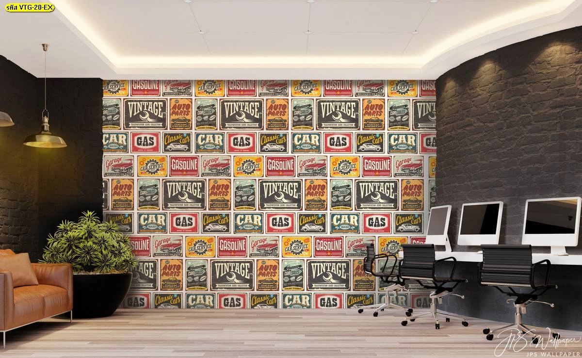 ตกแต่งห้องแนววินเทจโบราณลวดลายป้ายโฆษณาอเมริกันคลาสสิก ห้องทำงานสไตล์อุตสาหกรรม ภาพป้ายโฆษณารถยนต์และน้ำมันเบนซินยุค 1950-1960 สำหรับนักสะสมโบราณคดี