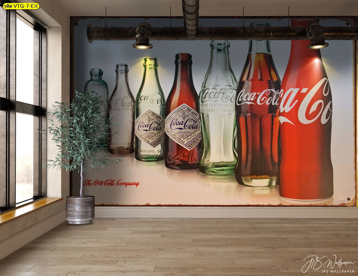 ภาพงานศิลปะติดผนังสไตล์วินเทจลวดลายขวดเครื่องดื่มโบราณคลาสสิก แสดงวิวัฒนาการของบรรจุภัณฑ์เครื่องดื่มตั้งแต่ยุค 1950 สำหรับผู้เชี่ยวชาญวัฒนธรรมการดื่มวินเทจ