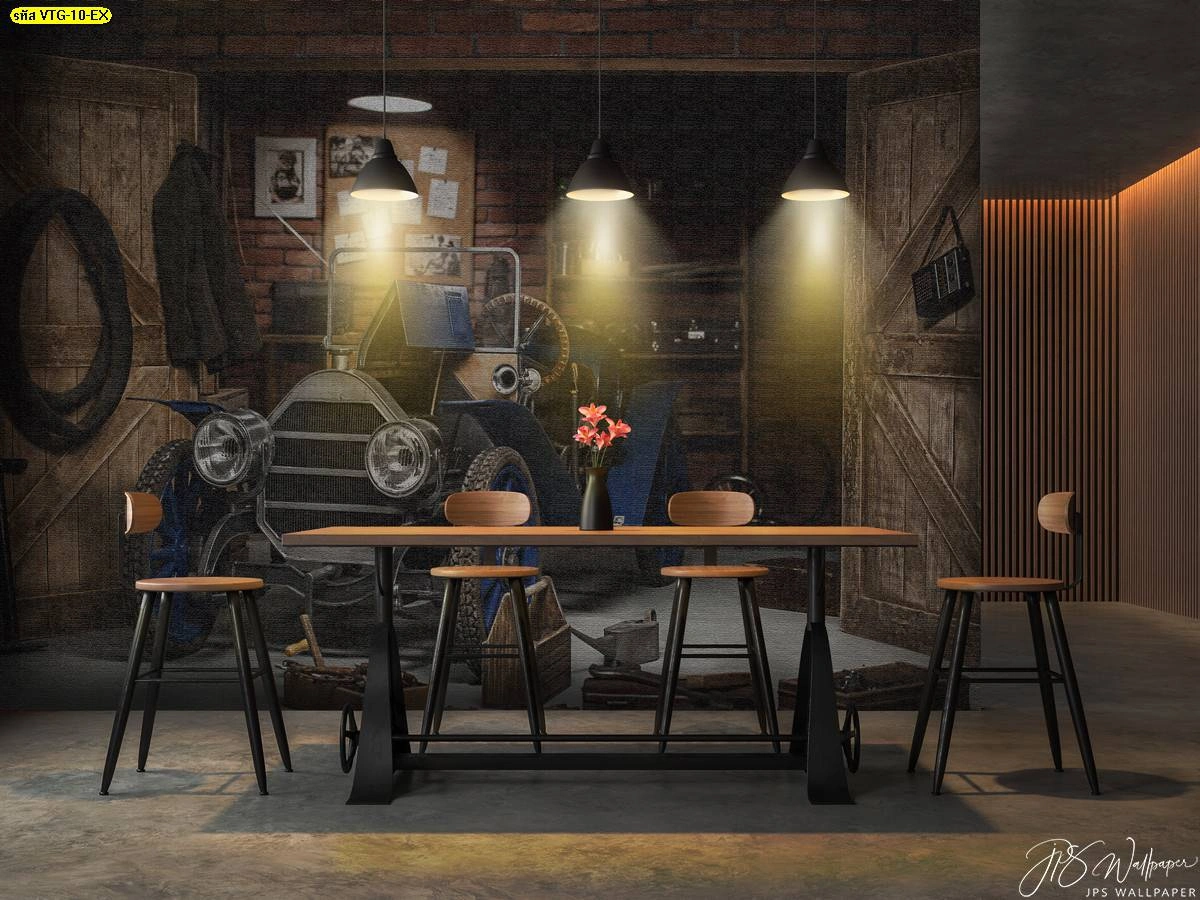 สร้างบรรยากาศห้องอาหารสไตล์อุตสาหกรรมด้วยภาพรถคลาสสิกโทนเข้ม