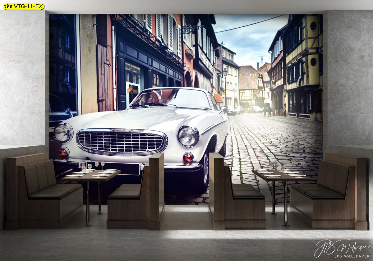 วอลเปเปอร์ภาพรถคลาสสิก สีขาวบนถนนหินยุโรป สำหรับตกแต่งคาเฟ่สไตล์ยุโรเปียนคลาสสิก