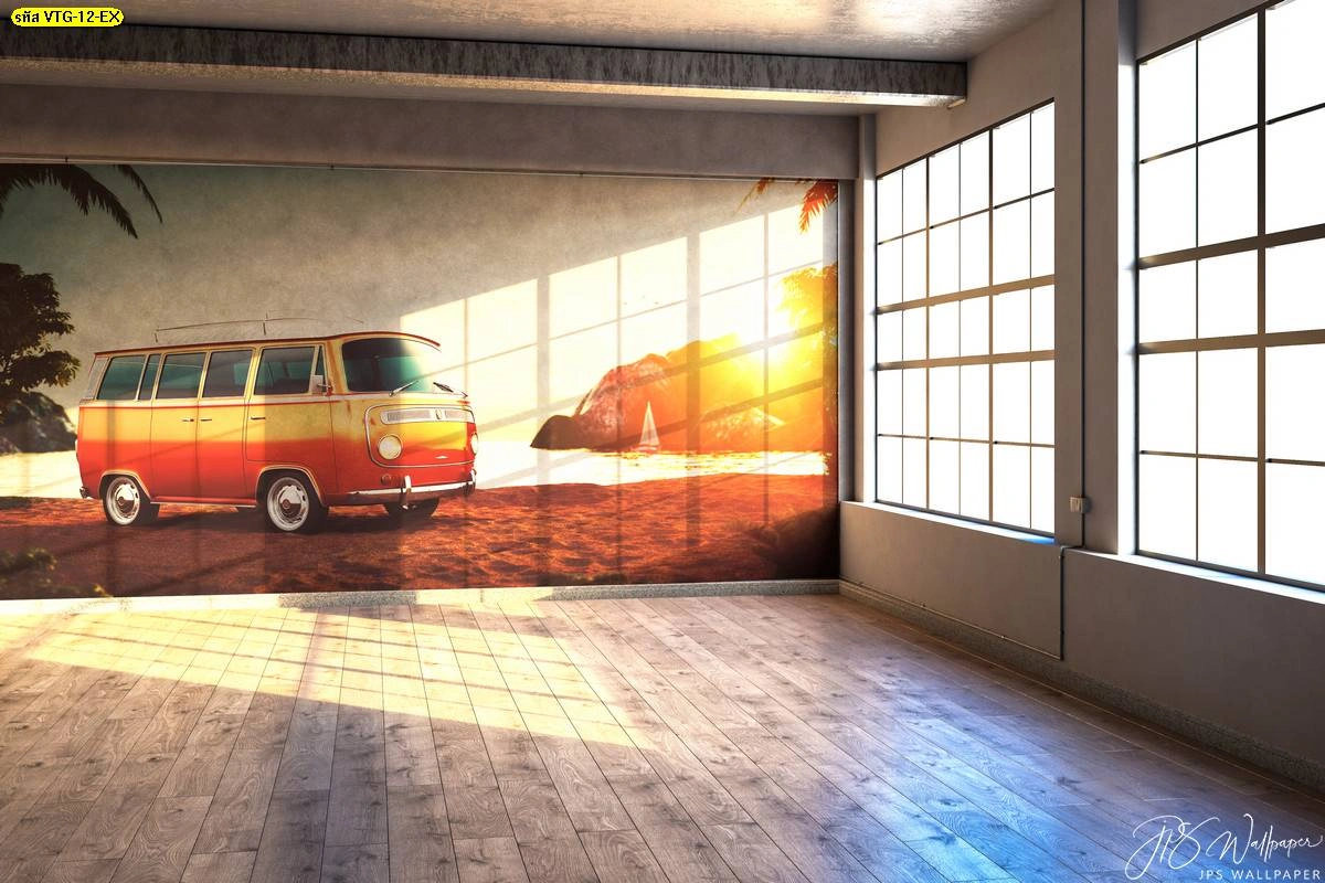 วอลเปเปอร์ภาพรถคลาสสิก สีส้มริมทะเลช่วงพระอาทิตย์ตกดิน สำหรับตกแต่งพื้นที่พักผ่อนสไตล์บีชคาเฟ่และร้านอาหารบรรยากาศชิลล์