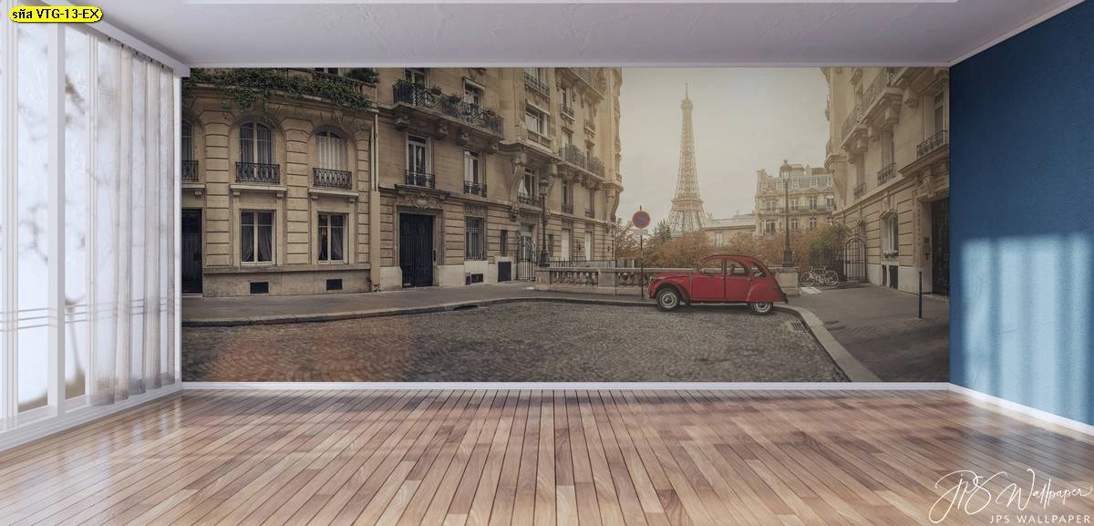 ภาพวิวรถคลาสสิกสีแดงบนถนนหินสไตล์ฝรั่งเศสพร้อมหอไอเฟล สำหรับตกแต่งร้านอาหารฝรั่งเศสและคาเฟ่บิสโทรสไตล์ยุโรป