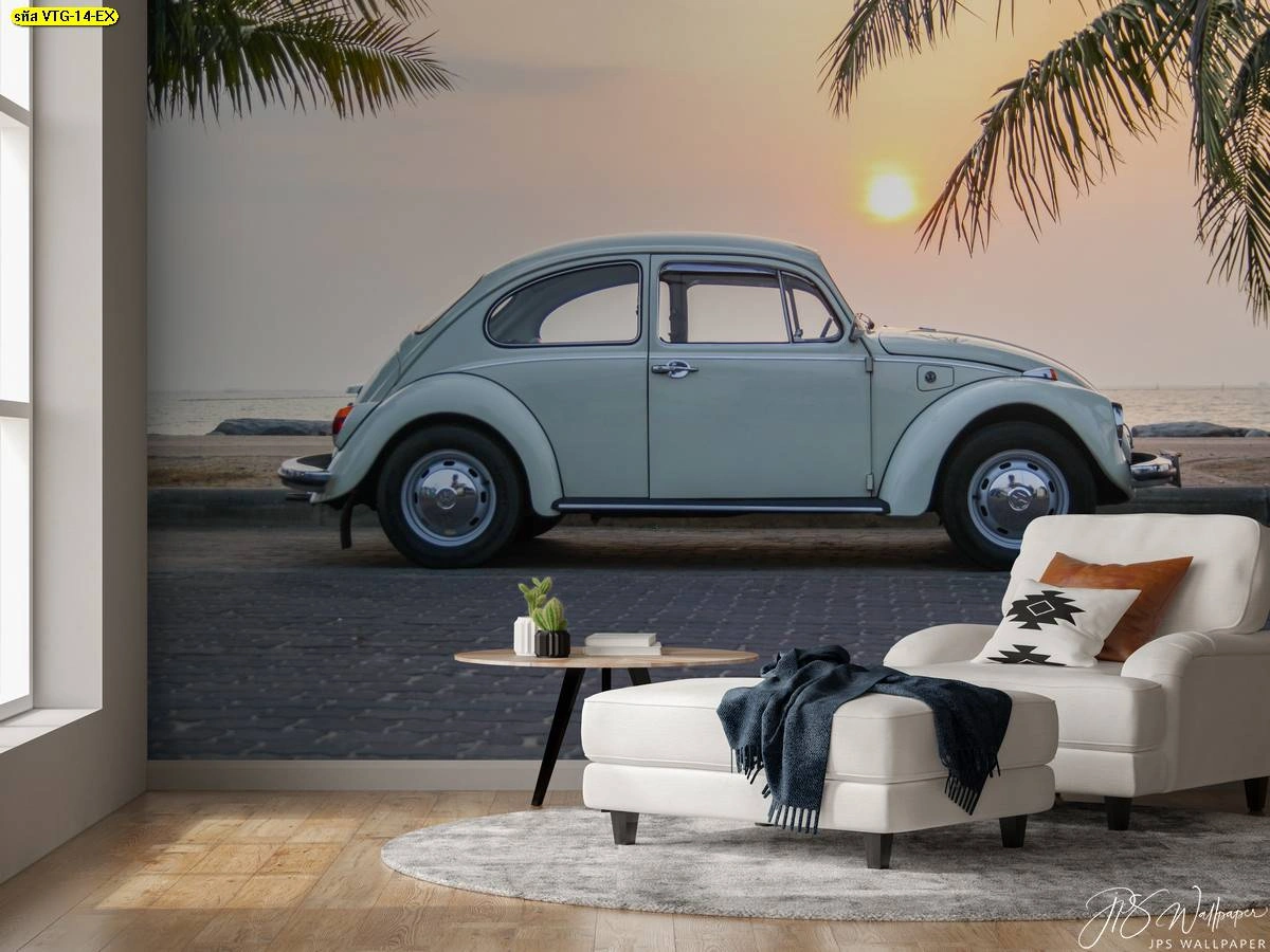 วอลเปเปอร์ภาพรถคลาสสิก สีฟ้าริมทะเลช่วงพระอาทิตย์ตก สำหรับตกแต่งโซนพักผ่อนสไตล์บีช