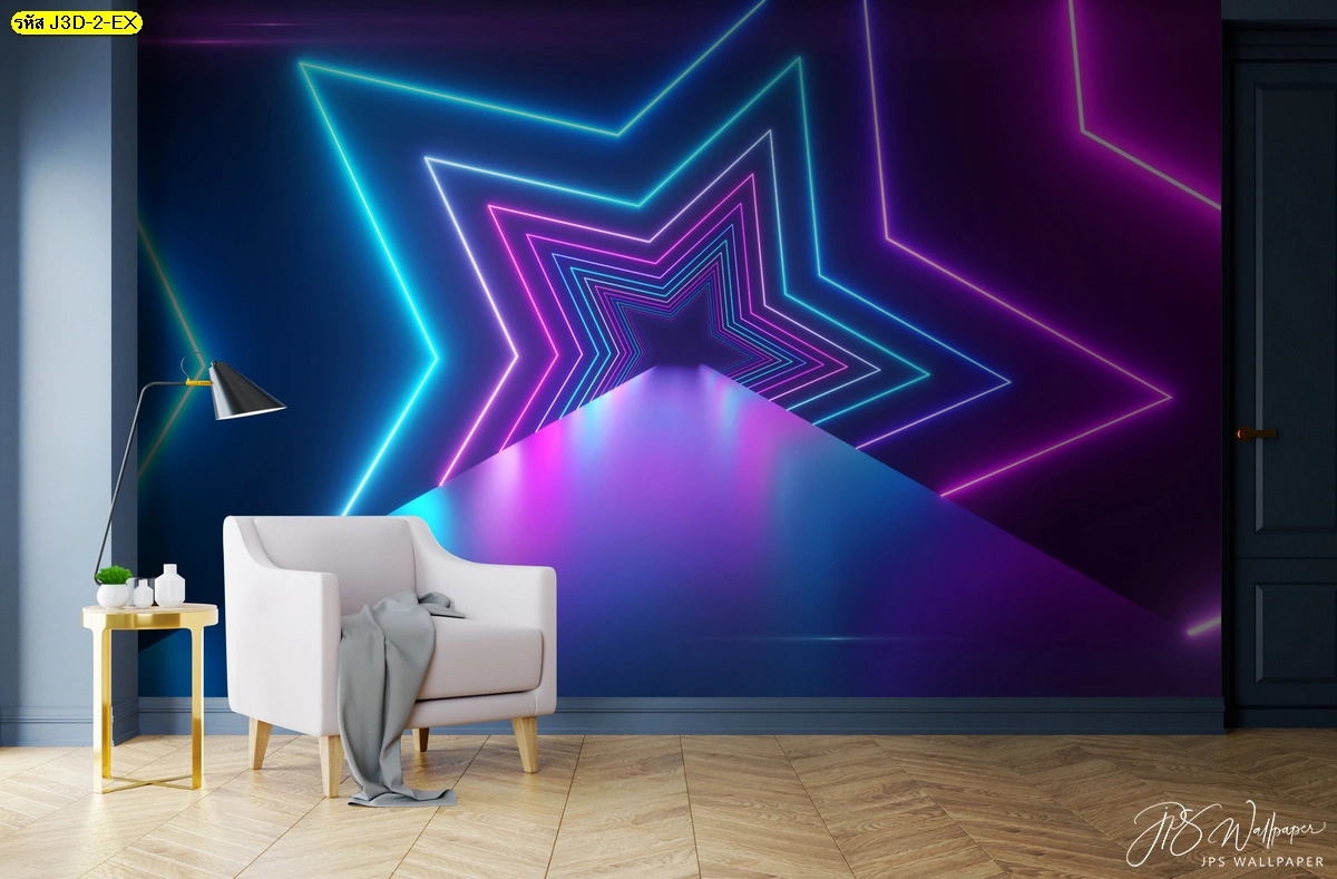 วอลเปเปอร์แต่งห้องสมัยใหม่ ภาพไลท์นีออนดาวสีฟ้าชมพูม่วงอุโมงค์เรืองแสงตกแต่งห้องนั่งเล่นห้องบันเทิงสไตล์ฟิวเจอริสติก