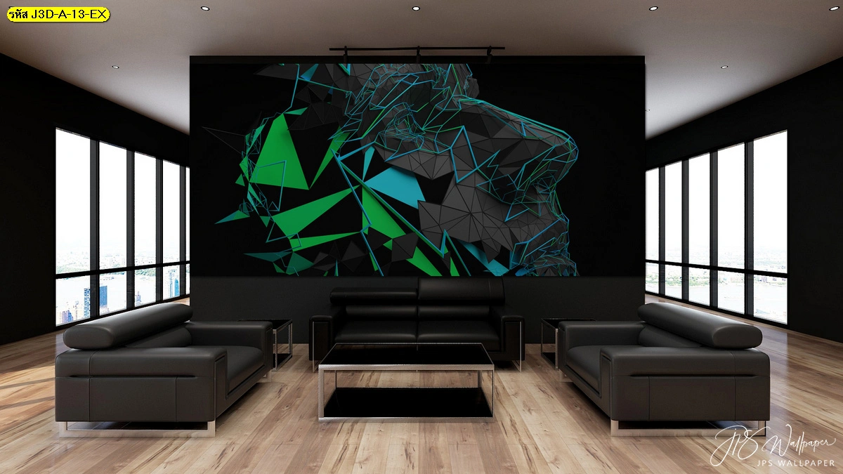 ภาพศิลปะเสือโคร่ง Low Poly 3D สไตล์กราฟิกทันสมัยโทนสีเขียวสดฟ้าสว่างบนพื้นดำเหมาะสำหรับตกแต่งห้องประชุมออฟฟิศธุรกิจสตาร์ทอัพที่ต้องการสื่อสารความแข็งแกร่งและนวัตกรรม วอลเปเปอร์สั่งพิมพ์รูปติดผนังรูปแบบนี้ใช้เทคนิคการออกแบบโพลีกอนต่ำสร้างหน้าเสือที่ประกอบด้วยรูปสามเหลี่ยมหลายสีซ้อนทับกันสร้างมิติและความเคลื่อนไหวแบบไดนามิก ภาพศิลปะตกแต่งภายในสไตล์อินดัสเทรียลนี้จะกระตุ้นพลังสร้างสรรค์และความกล้าหาญในการตัดสินใจทางธุรกิจของทีมงานและนักลงทุน ห้องประชุมออกแบบด้วยโซฟาหนังสีดำทรงกล่องพื้นไม้สีน้ำตาลและหน้าต่างกระจกขนาดใหญ่สร้างบรรยากาศโล่งและเป็นสัดส่วน