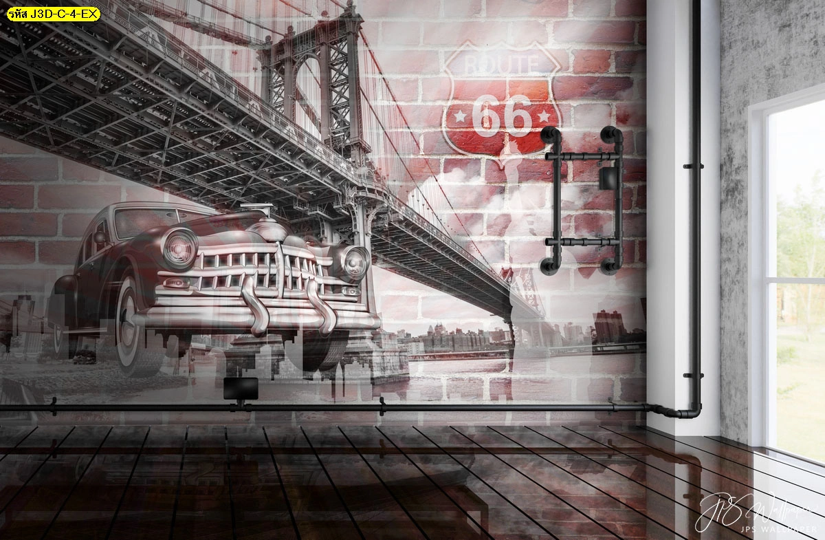 วอลเปเปอร์สั่งพิมพ์ 3D รถคลาสสิกสะพานเมืองโทนสีแดงน้ำตาลสไตล์วินเทจอินดัสเทรียลตกแต่งห้องทำงานโชว์รูมรถสะสม