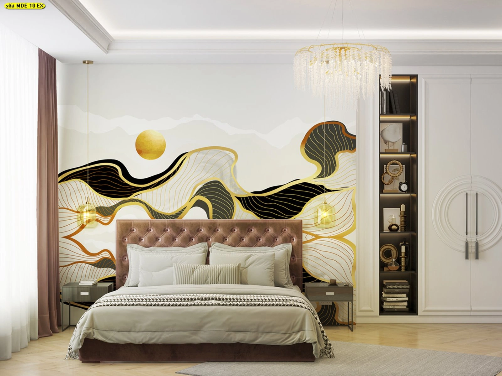 ภาพศิลปะนามธรรมคลื่นทองดำขาวเส้นสีทองลายเซ็นสไตล์หรูหราโมเดิร์นลักชัวรี่ตกแต่งห้องนอนมาสเตอร์