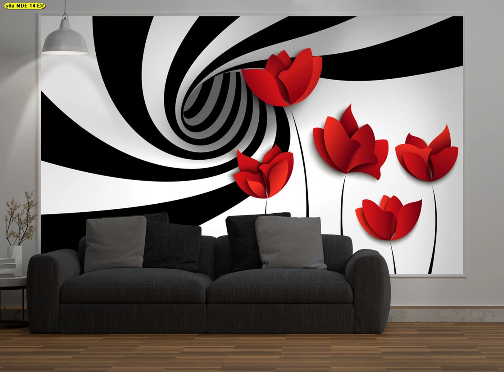 รูปติดผนังดอกไม้แดง 3D ลายเกลียวขาวดำตกแต่งห้องนั่งเล่นสไตล์โมเดิร์นมินิมอลสร้างจุดสนใจภาพศิลปะ