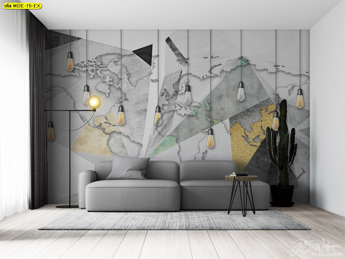 วอลเปเปอร์สั่งพิมพ์แผนที่โลก 3 มิติสไตล์อินดัสเทรียลโทนสีเทาผสมทองและเขียวมิ้นท์เหมาะสำหรับตกแต่งห้องนั่งเล่นออฟฟิศ ที่ต้องการสื่อสารวิสัยทัศน์ระดับโลก ภาพศิลปะตกแต่งภายในรูปแบบนี้จะสร้างบรรยากาศมืออาชีพและทันสมัยด้วยลวดลายแผนที่ทวีปที่มีมิตินูนต่ำพร้อมองค์ประกอบเรขาคณิตสามเหลี่ยมสีดำ รูปติดผนังผ้าแคนวาสไร้รอยต่อขนาดใหญ่จะช่วยเพิ่มความน่าเชื่อถือและเสริมภาพลักษณ์ธุรกิจที่มีเครือข่ายระดับสากล พื้นที่ห้องนั่งเล่นประกอบด้วยโซฟาสีเทาทรงโมเดิร์นพื้นไม้สีอ่อนและแสงธรรมชาติจากหน้าต่างสร้างความกลมกลืนกับโทนสีของวอลเปเปอร์
