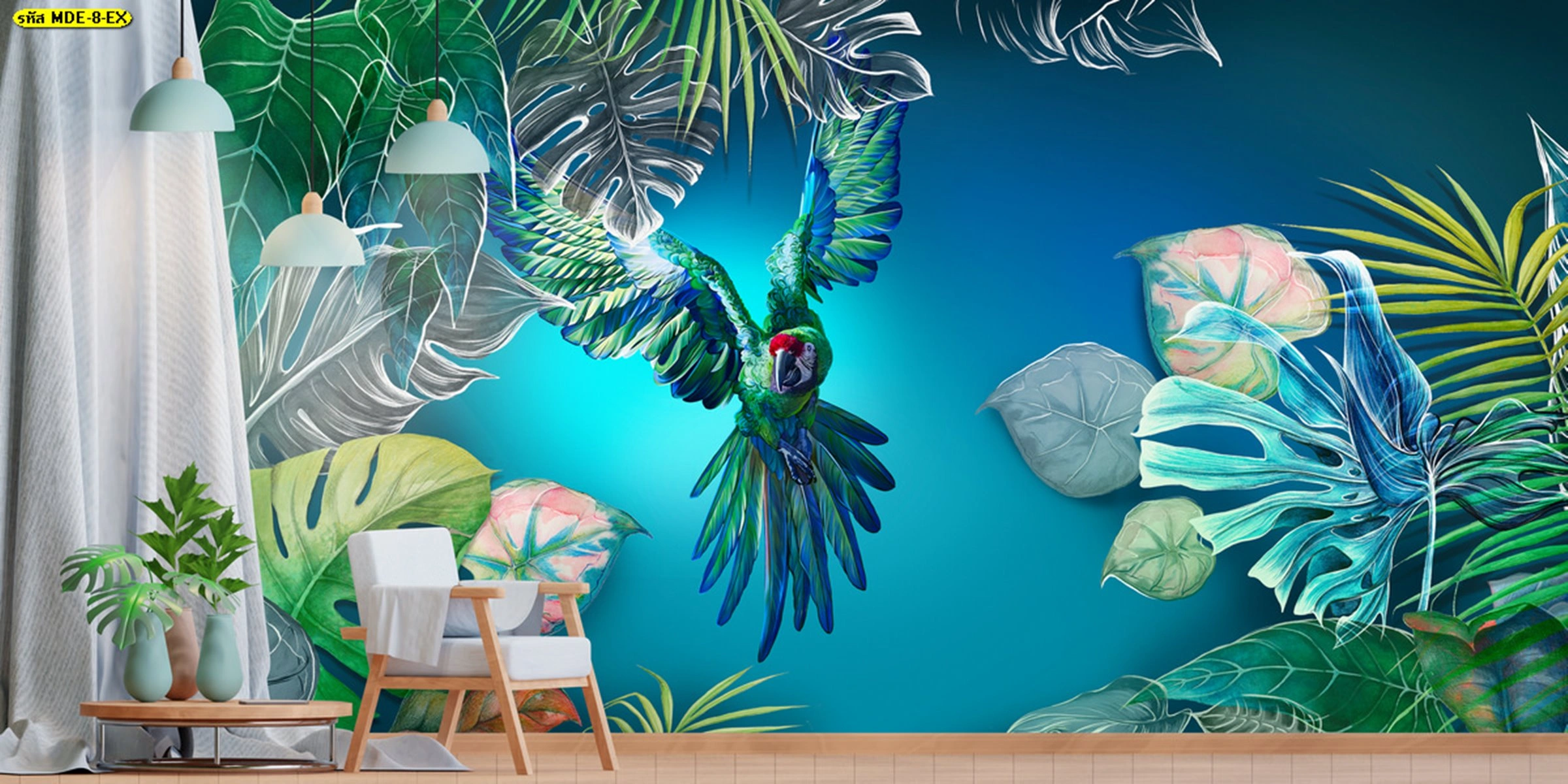 วอลเปเปอร์แต่งห้องสมัยใหม่ ภาพศิลปะนกแก้วโพลีเครเตอร์บินใบไม้เขตร้อนสีเขียวฟ้าโทนพาสเทลตกแต่งห้องนั่งเล่นสไตล์ทรอปิคัล