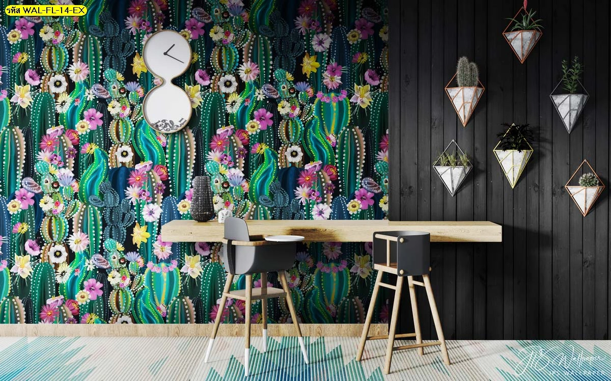 วอลเปเปอร์สั่งพิมพ์ลายกระบองเพชรดอกไม้สีสันสดใสโทนเขียวชมพูม่วงเหลืองสไตล์ทรอปิคัลโบฮีเมียนตกแต่งห้องทำงานคาเฟ่