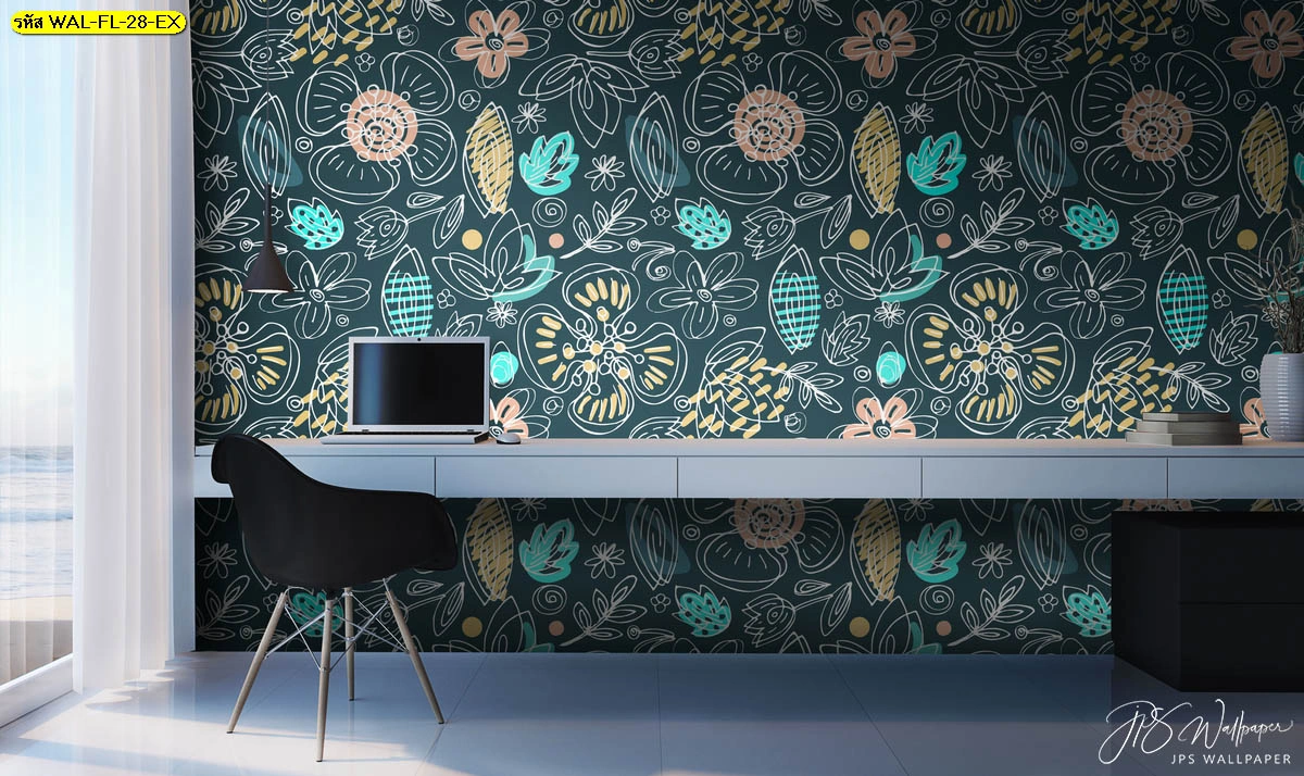 วอลเปเปอร์ผ้าแคนวาสลายดอกไม้เส้นวาดโทนเขียวเข้มทองชมพูฟ้าตกแต่งห้องทำงานสไตล์คอนเทมโพรารี่