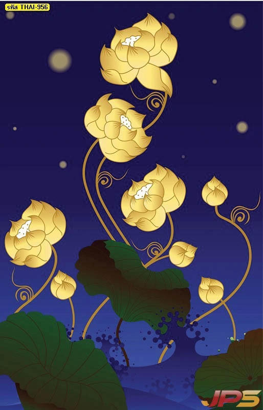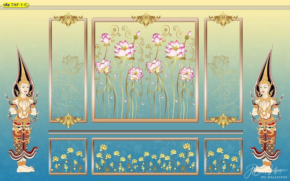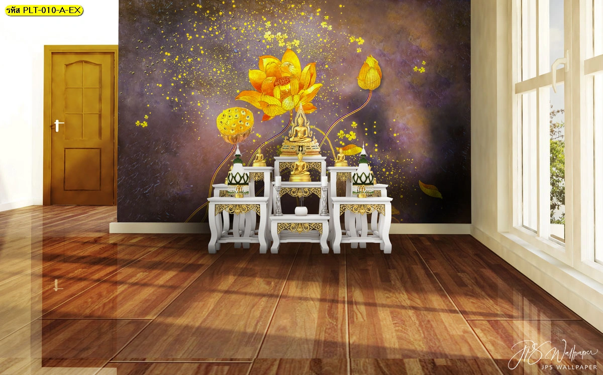วอลเปเปอร์ห้องพระลายไทยดอกบัวทองพิมพ์ลายแนวตั้ง เหมาะตกแต่งผนังในห้องพระให้มีมิติ