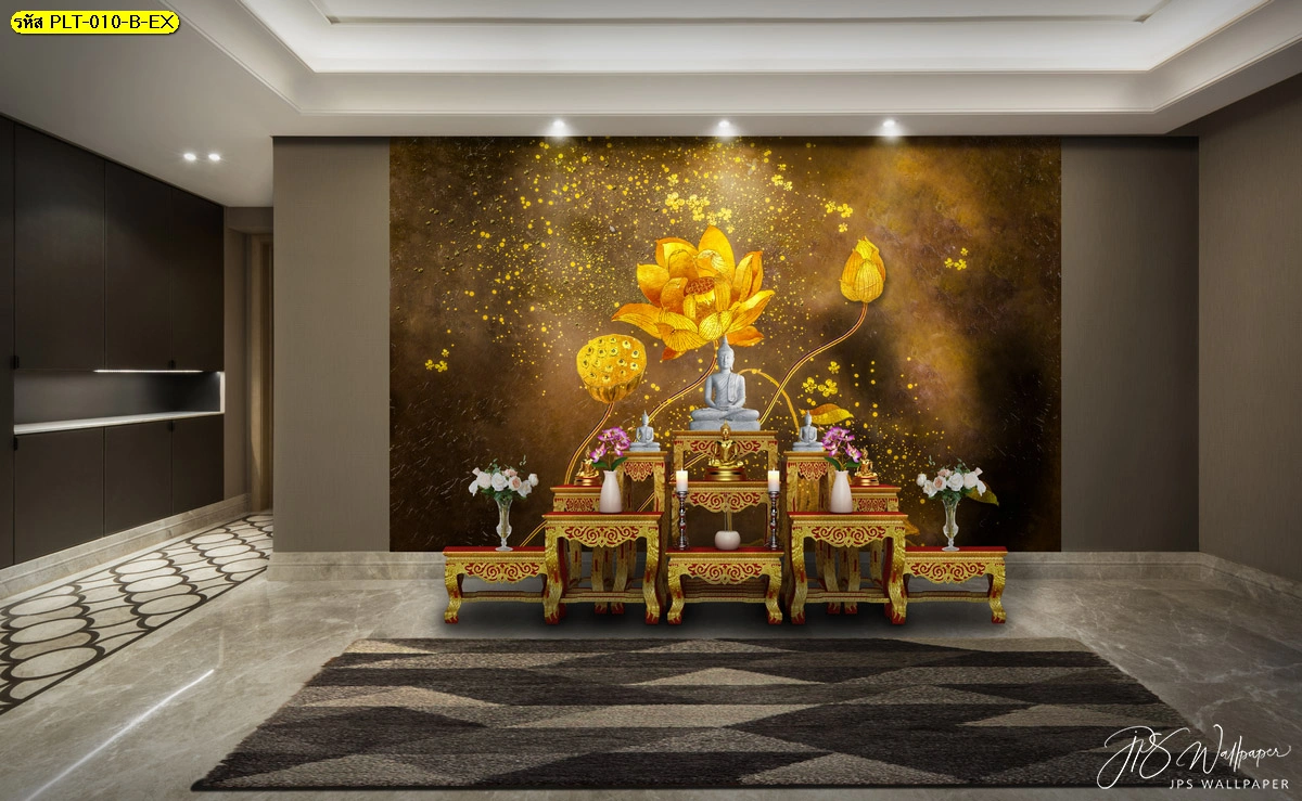 วอลเปเปอร์ห้องพระไทยประยุกต์ภาพจำลองดอกบัวสีทองบนพื้นสีเข้มช่วยสร้างบรรยากาศดูโดดเด่นสำหรับห้องพระยุคใหม่