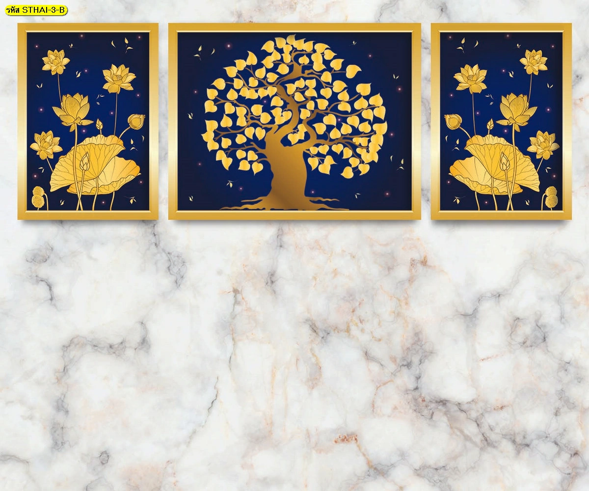 ภาพพุทธศิลป์ตกแต่งผนังห้องพระลายไทยประยุกต์โทนสีน้ำเงินเข้มตัดกับลายเส้นสีทองสะท้อนความหรูหราทรงพลังสำหรับตกแต่งภายในบ้านพักอาศัย