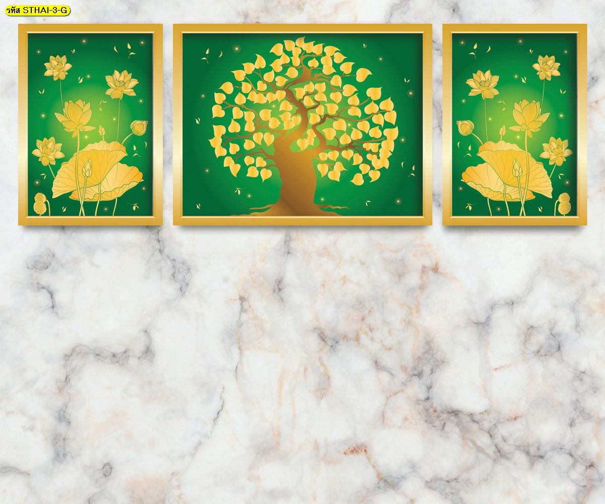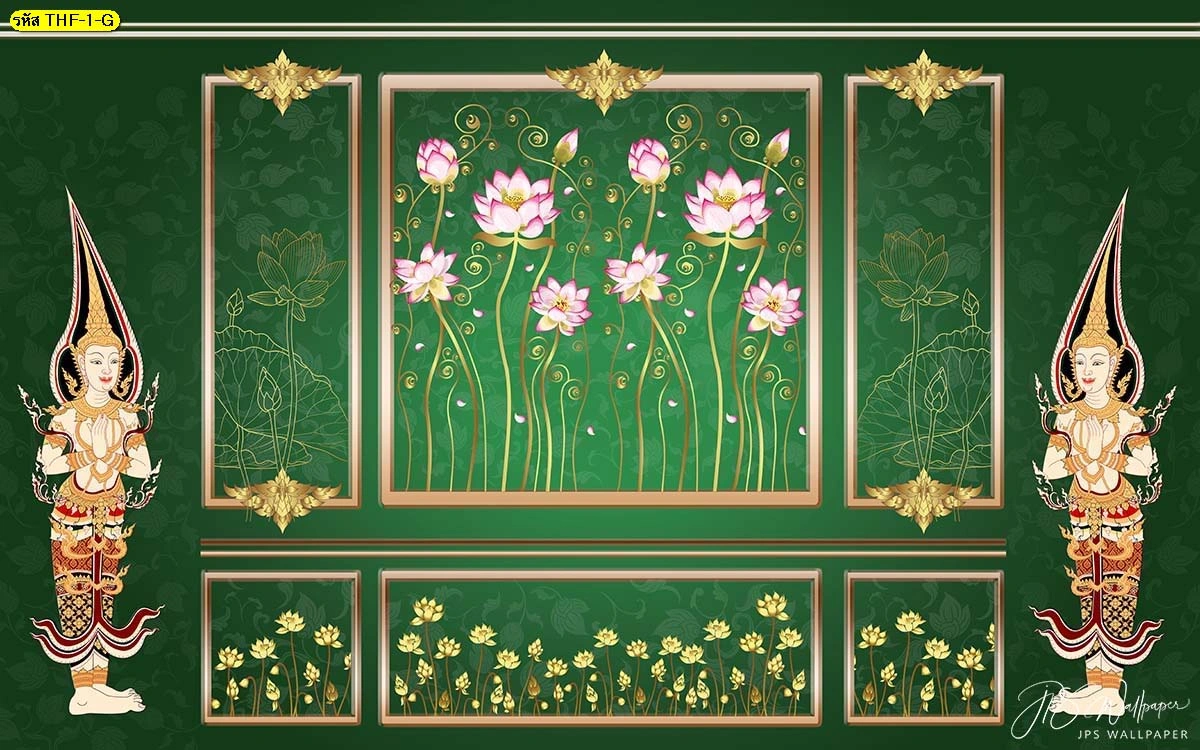ภาพวอลเปเปอร์ลายดอกบัวสีทองพื้นเขียวเข้ม สั่งพิมพ์ตกแต่งห้องพระให้สวยเสริมบารมี