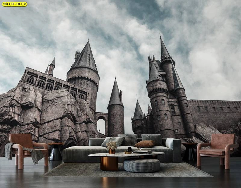 วอลเปเปอร์สั่งพิมพ์ภาพปราสาทโบราณสไตล์แฟนตาซีช่วยเสริมบรรยากาศเซอร์เรียลและสร้างมิติความลึกให้ห้องนั่งเล่นรีสอร์ท