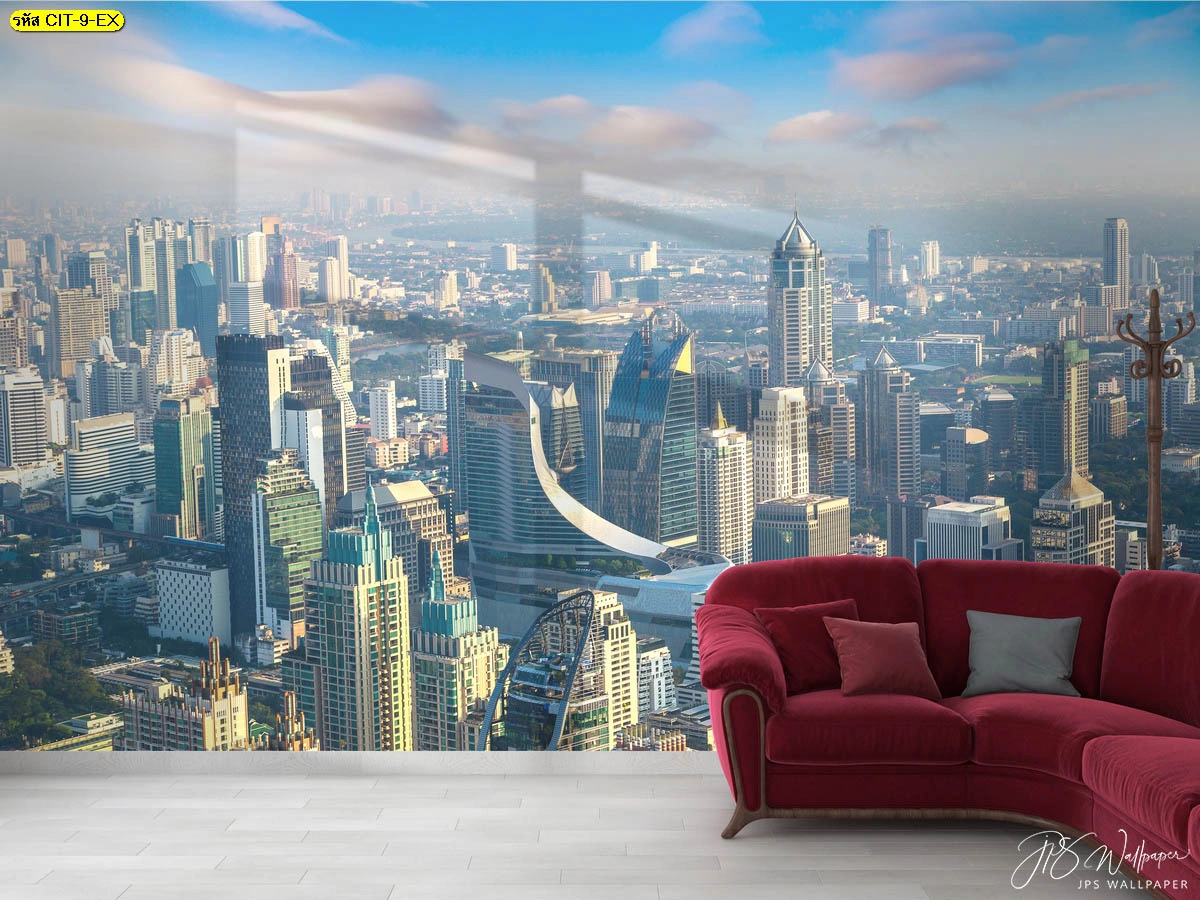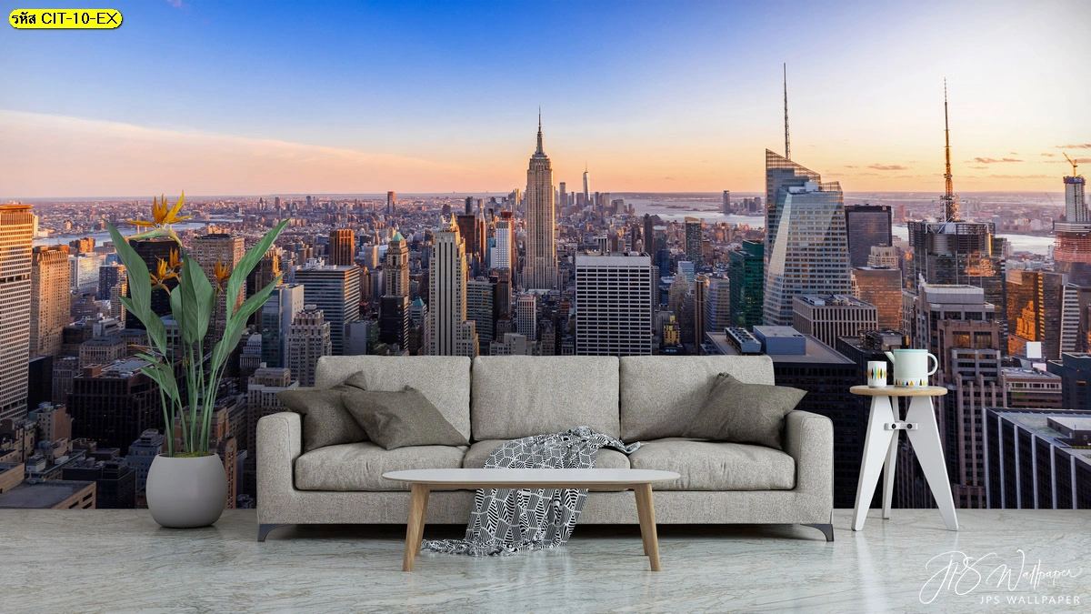 วอลเปเปอร์ภาพวิวเมือง ศิลปะตกแต่งวิวเมืองมหานครมุมสูงภาพขยายจัดเต็มผนังช่วยเปิดกว้างพื้นที่ห้องรับแขกโมเดิร์นคลาสสิก
