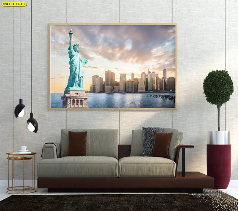 ภาพศิลปะเทพีเสรีภาพ วิวเมืองริมอ่าวโทนอบอุ่นในกรอบไม้สีอ่อนช่วยเสริมบรรยากาศห้องนั่งเล่นโมเดิร์นให้ดูหรูหรามีน้ำหนักและเพิ่มมิติความลึกสู่สายตาผู้ชมทุกมุมมอง