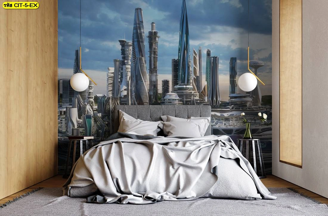 วอลเปเปอร์ภาพตึกแห่งอนาคตฟิวเจอริสติกพิมพ์ไร้รอยต่อช่วยยกระดับห้องนอนนักออกแบบสู่แรงบันดาลใจแนวไซไฟ